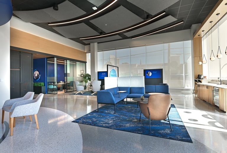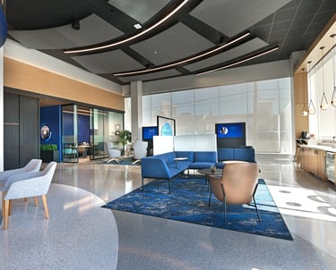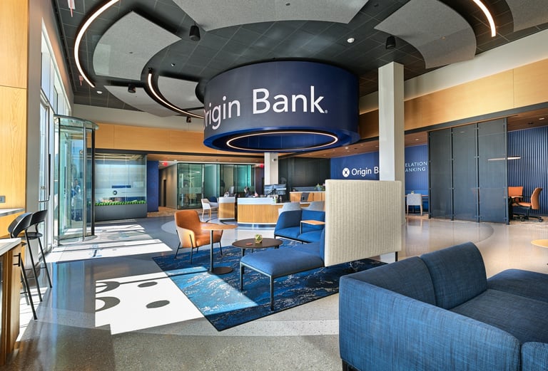 Paired with a brand refresh, Origin Bank wanted to make an impact in a new, affluent market. Marrying brand strategy with experience design, the concept of an origin point drove the design focal points, connecting the first and second floors. Role: Interior Design Strategy, Concepting, Development