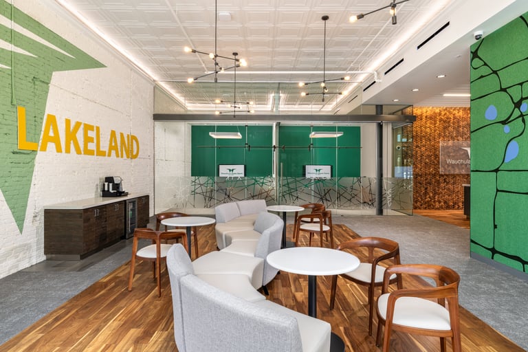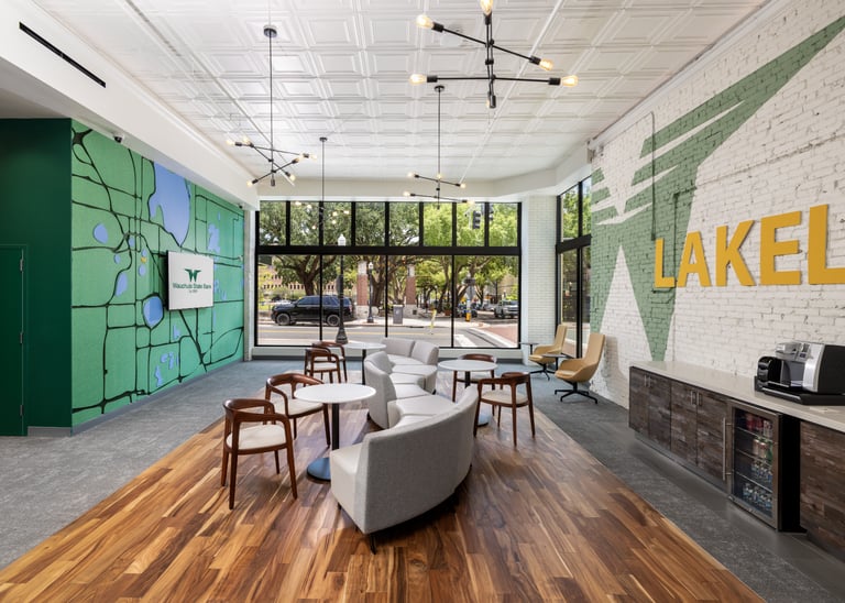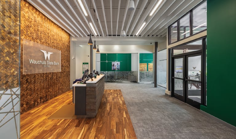 With a highly successful business lounge as precedent, Wauchula State Bank looked to open their second location in a new market. The space highlights local history including a custom felt map, etched wood artwork and a woven feature wall representing the harvesting baskets used in this town's booming strawberry industry. Role: Interior Design Strategy, Concepting, Development & Implementation